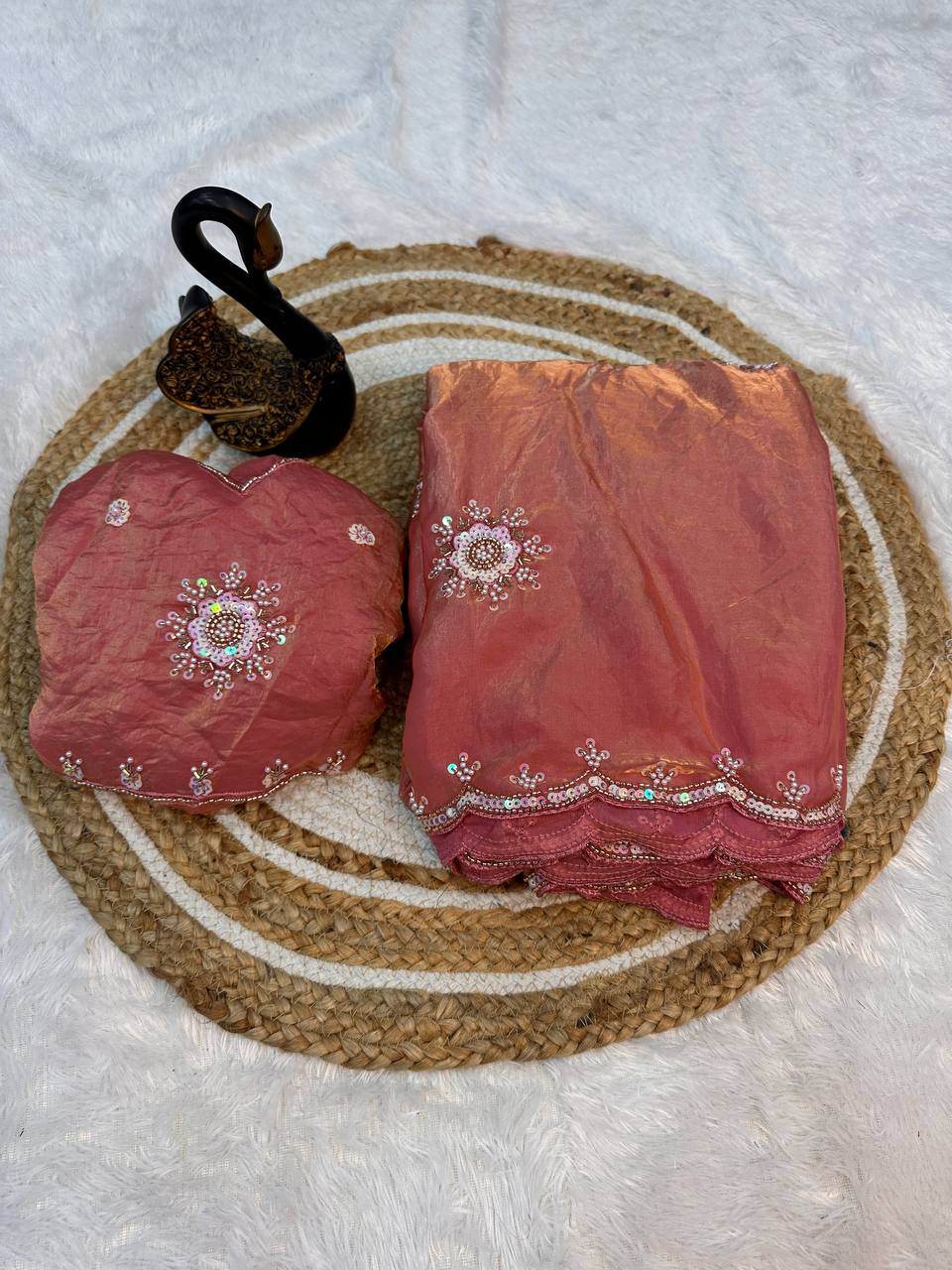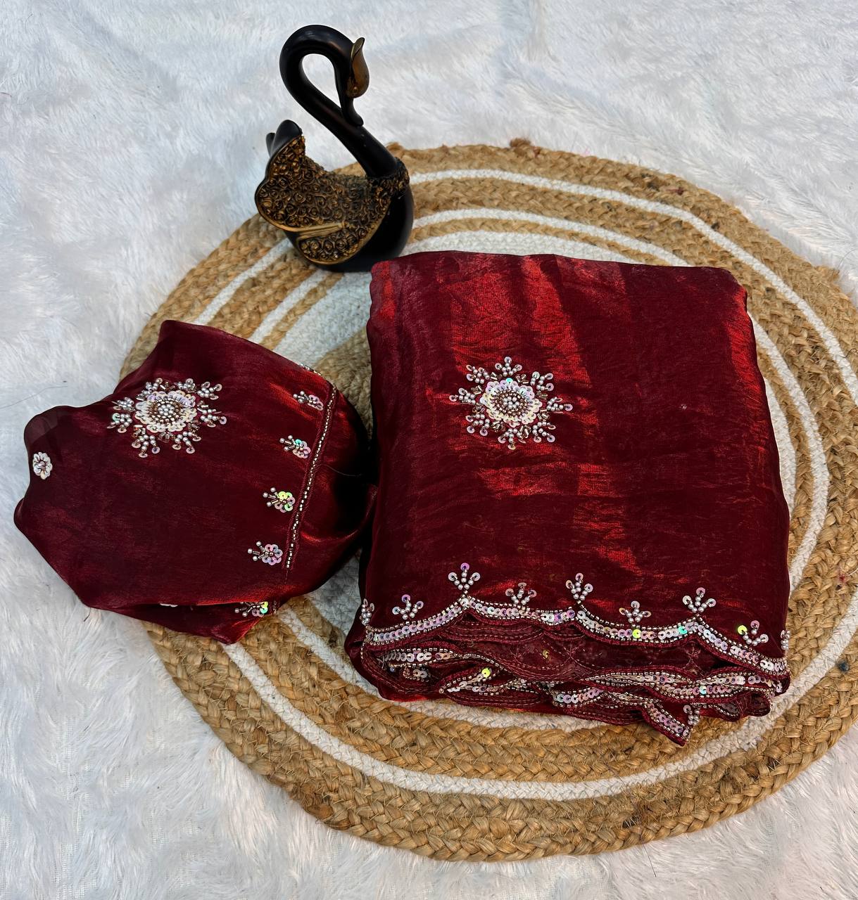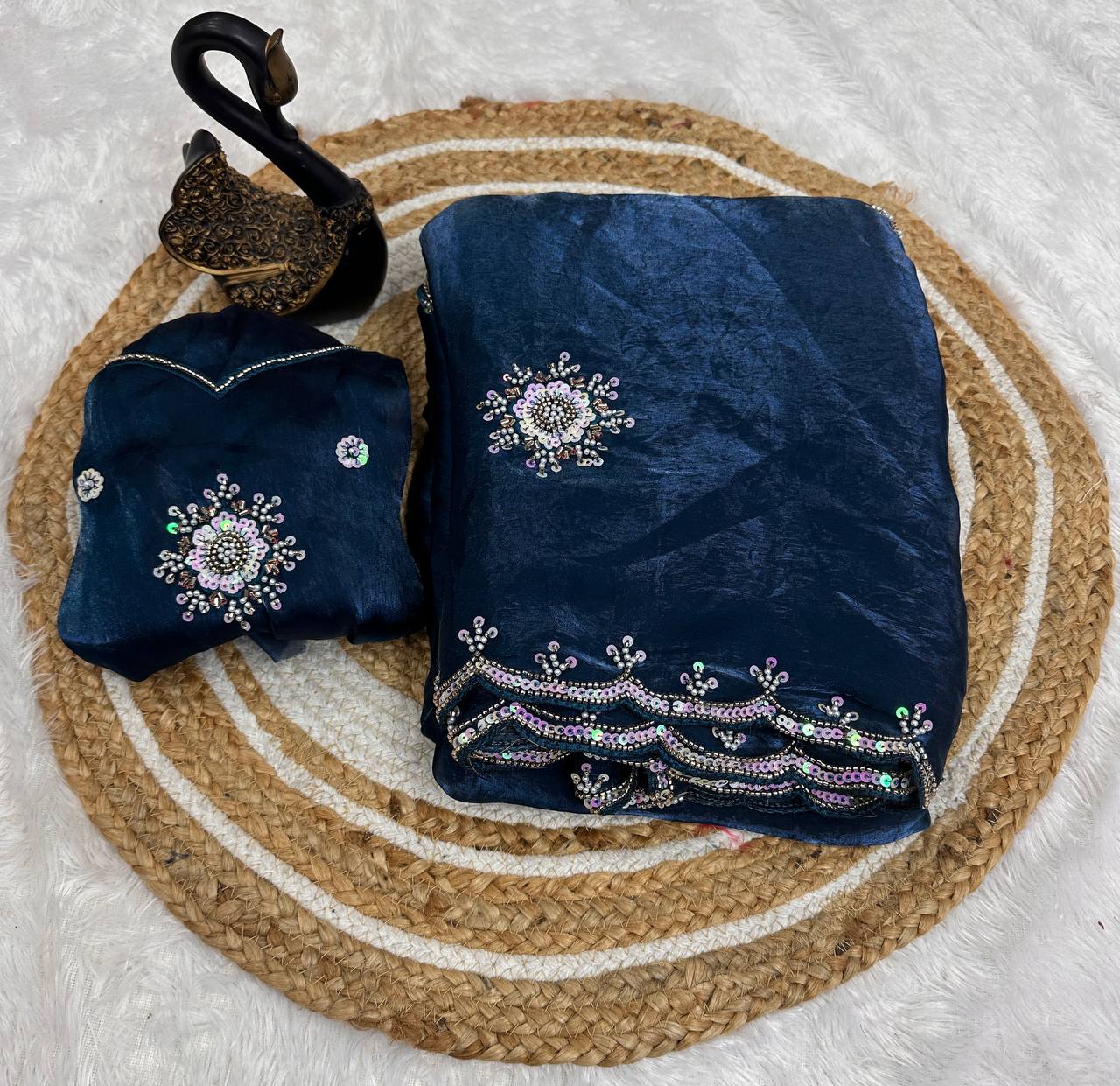 Presenting this beautiful and captivating designer saree by Nice, crafted from premium Soft Space Silk fabric to give you an elegant and luxurious look. The saree is adorned with beautiful sequins, katdana, and pearl work, adding a rich sparkle and refined charm.