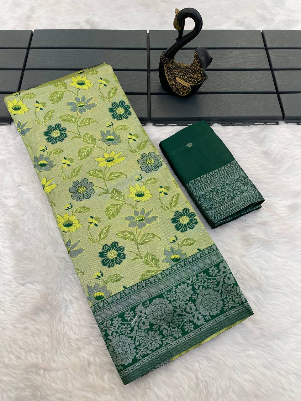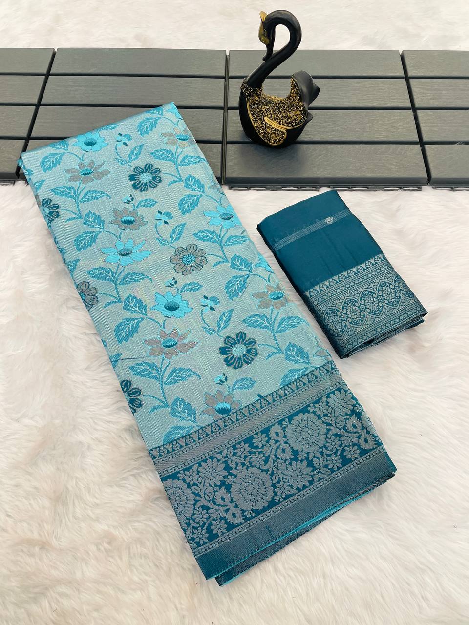 The luxurious tissue fabric offers a graceful shine and smooth drape, while the intricate triple weaving adds depth and royal charm. This concept saree is perfect for women who love traditional craftsmanship blended with modern elegance.